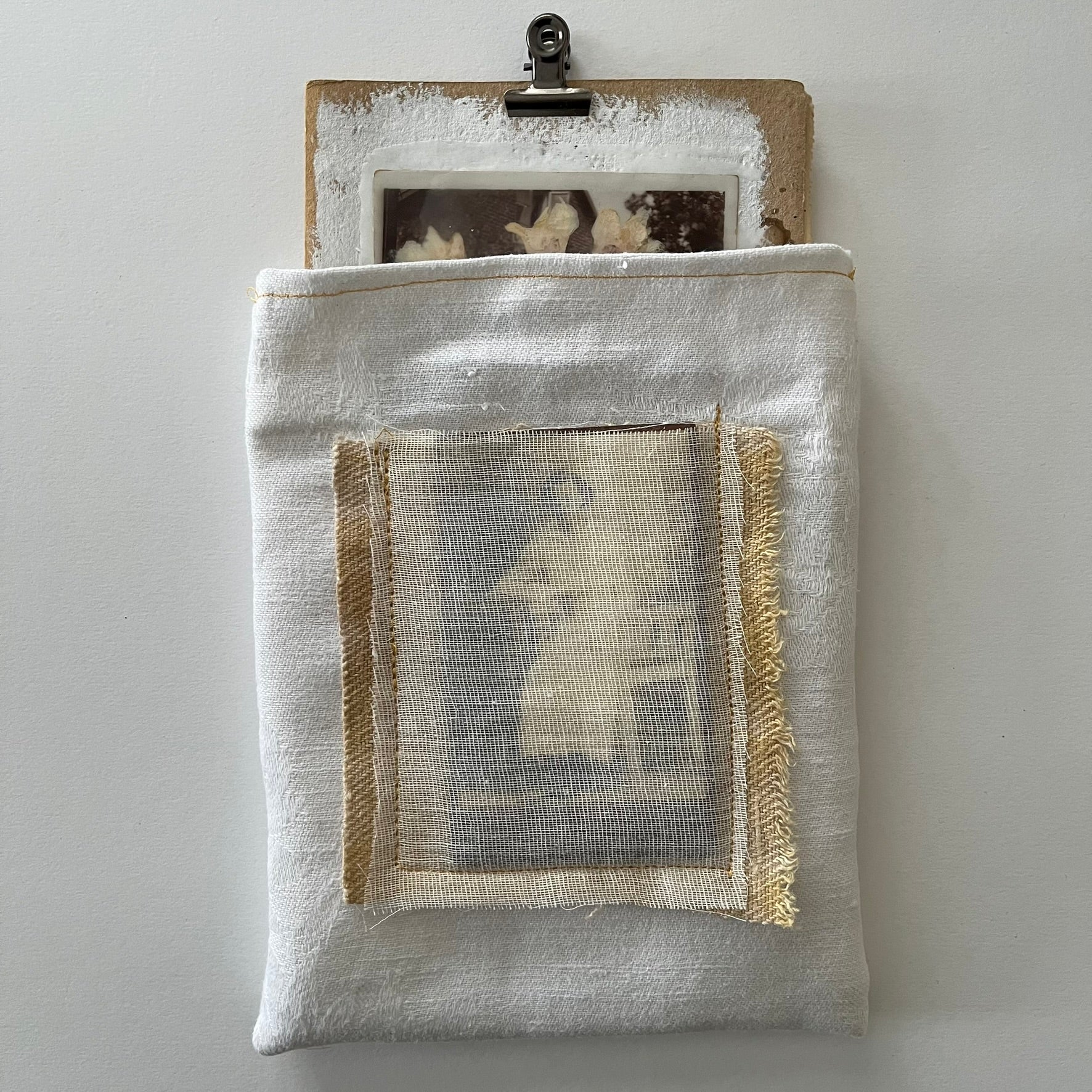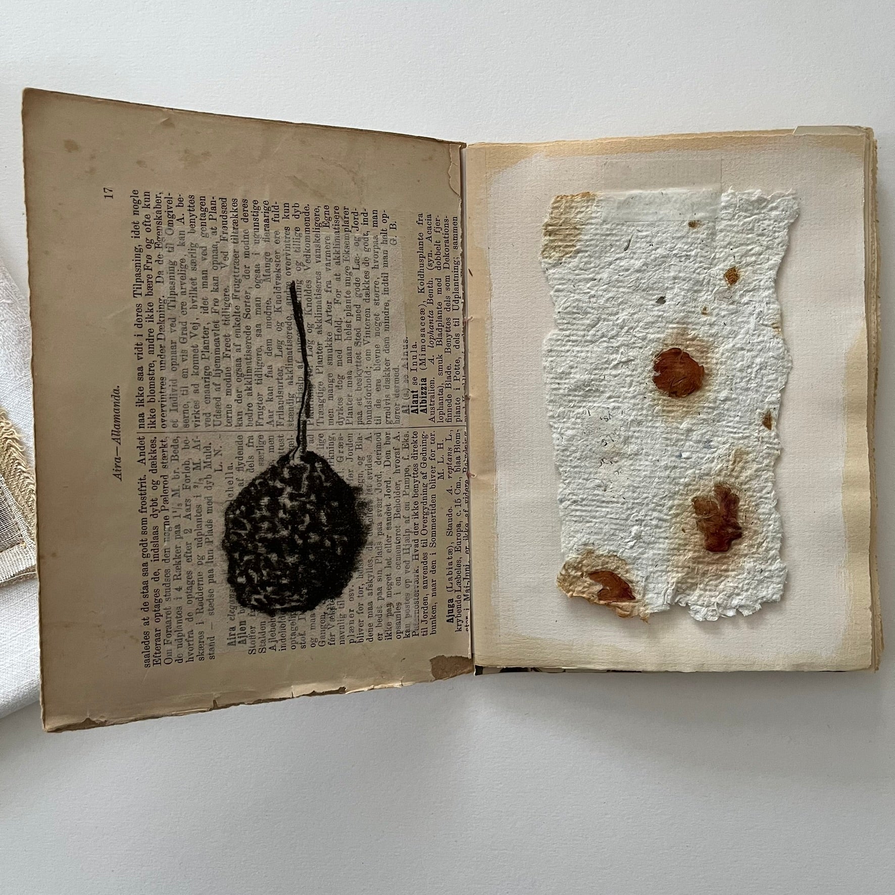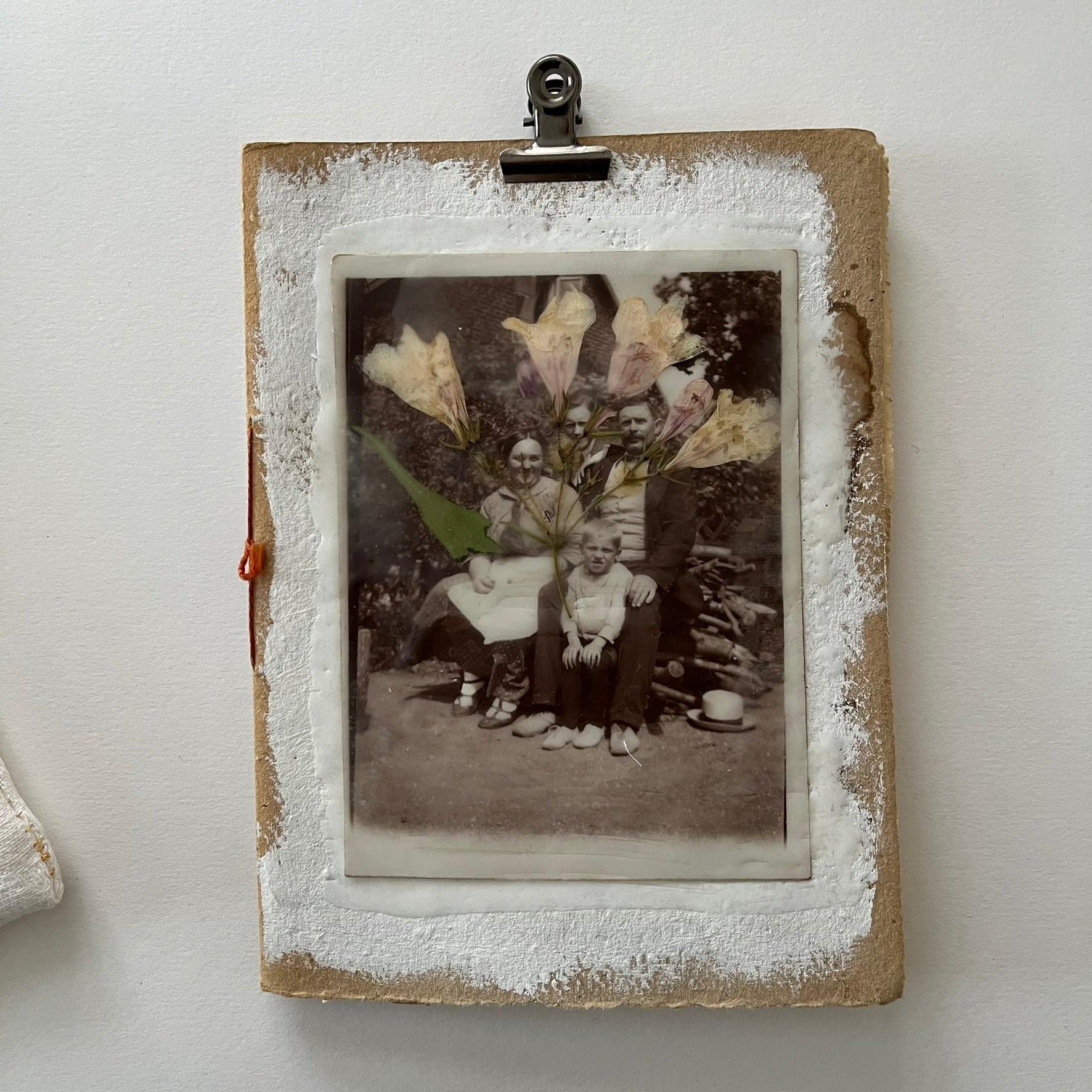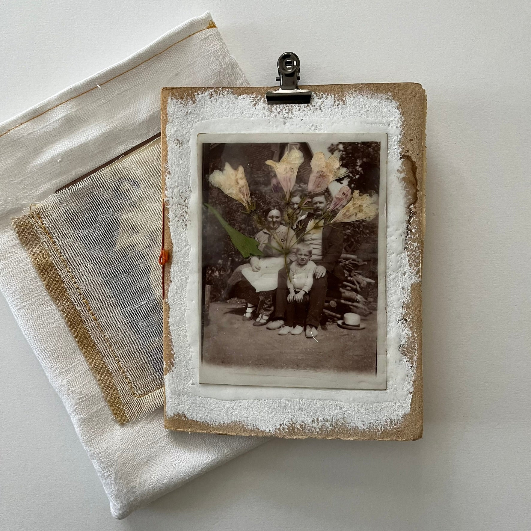 The cover is decorated with a vintage photo, a dried flower and covered with beeswax