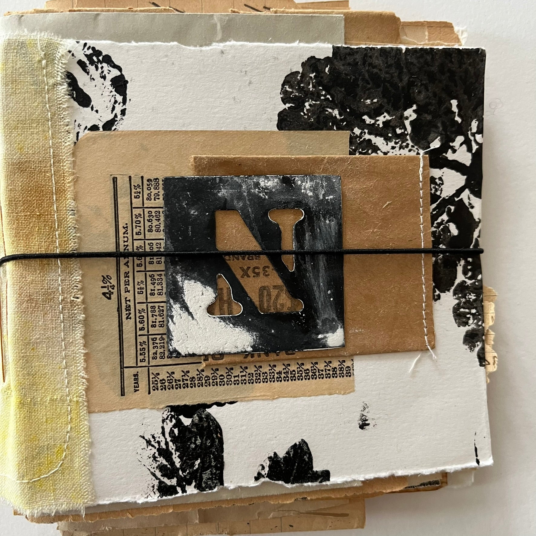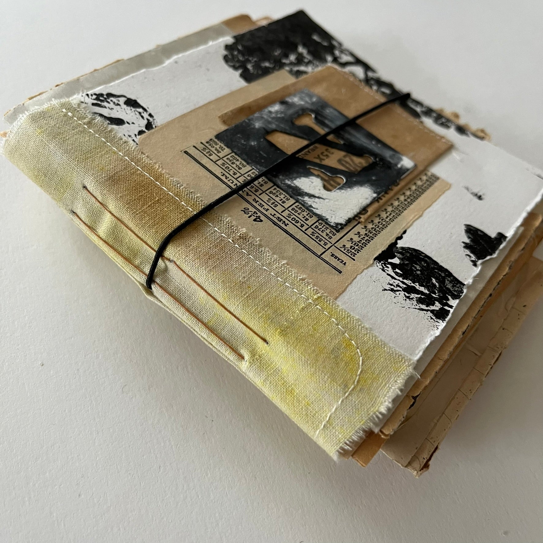 Cover made from eco dyed and hand printed paper with dyed fabric as spin